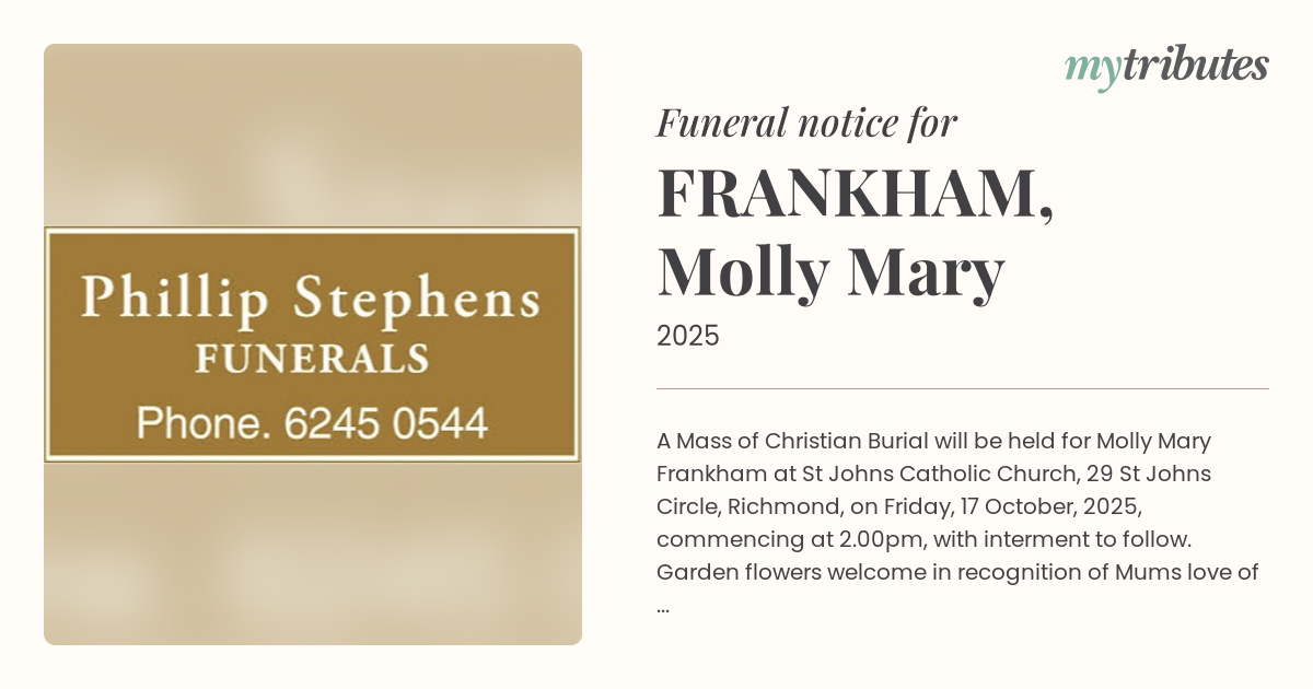 17°CA Mass of Christian Burial will be held for Molly Mary Frankham at St John’s Catholic Church, 29 St John’s Circle, Richmond, on Friday, 17 October, 2025, commencing at 2.00pm, with interment to follow.