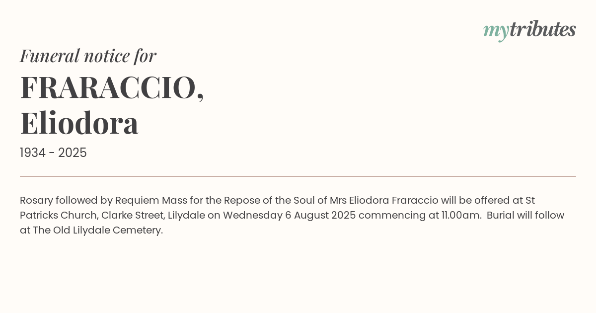 17°CRosary followed by Requiem Mass for the Repose of the Soul of Mrs Eliodora Fraraccio will be offered at St Patrick’s Church, Clarke Street, Lilydale on Wednesday 6 August 2025 commencing at 11.00am. Burial will follow at The Old Lilydale Cemetery.