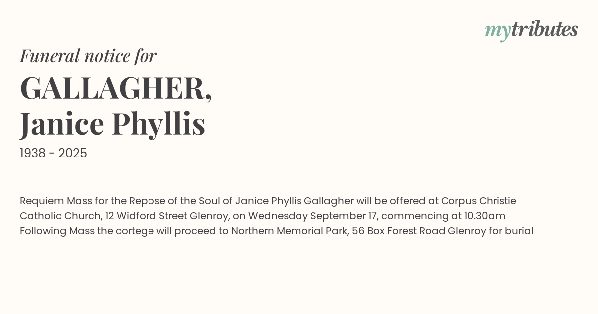 17°CRequiem Mass for the Repose of the Soul of Janice Phyllis Gallagher will be offered at Corpus Christie Catholic Church, 12 Widford Street Glenroy, on Wednesday September 17, commencing at 10.30am