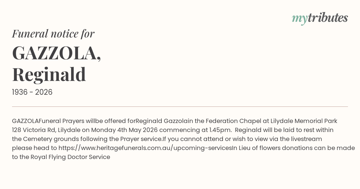in the Federation Chapel at Lilydale Memorial Park 128 Victoria Rd, Lilydale on Monday 4th May 2026 commencing at 1.45pm. Reginald will be laid to rest within the Cemetery grounds following the Prayer service.