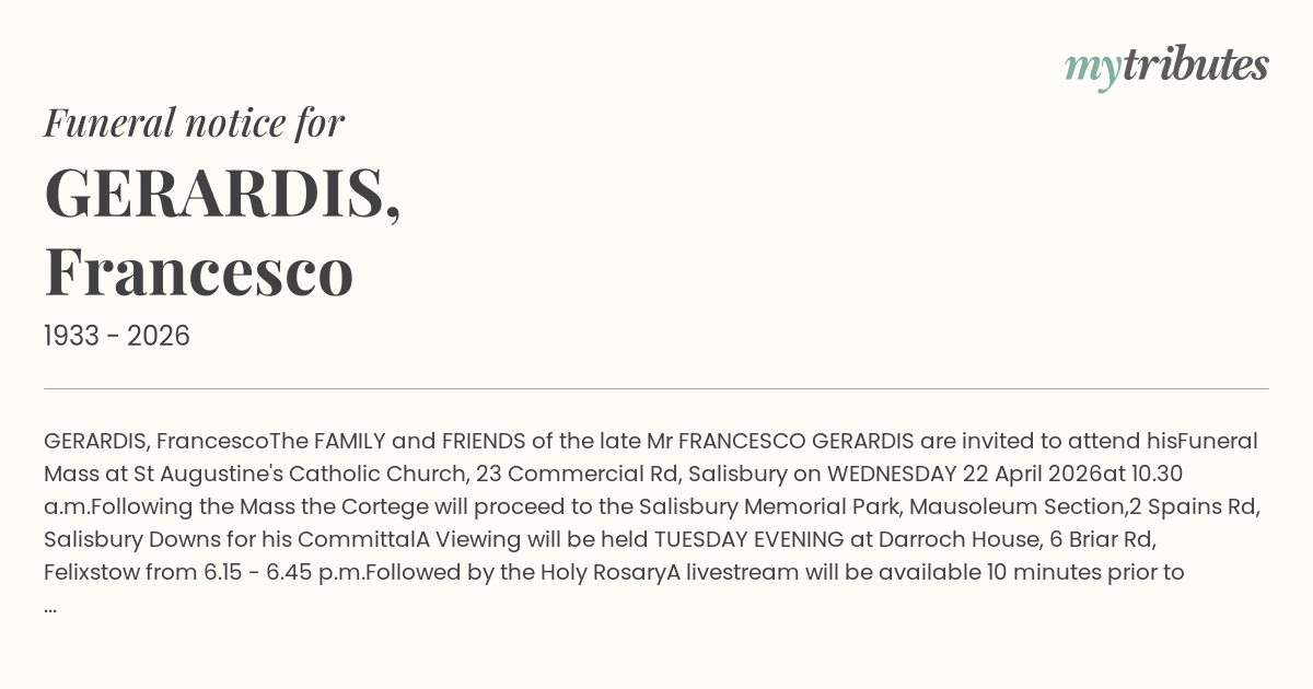 The FAMILY and FRIENDS of the late Mr FRANCESCO GERARDIS are invited to attend his
