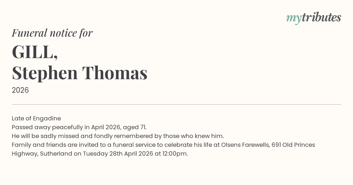 Family and friends are invited to a funeral service to celebrate his life at Olsens Farewells, 691 Old Princes Highway, Sutherland on Tuesday 28th April 2026 at 12:00pm.