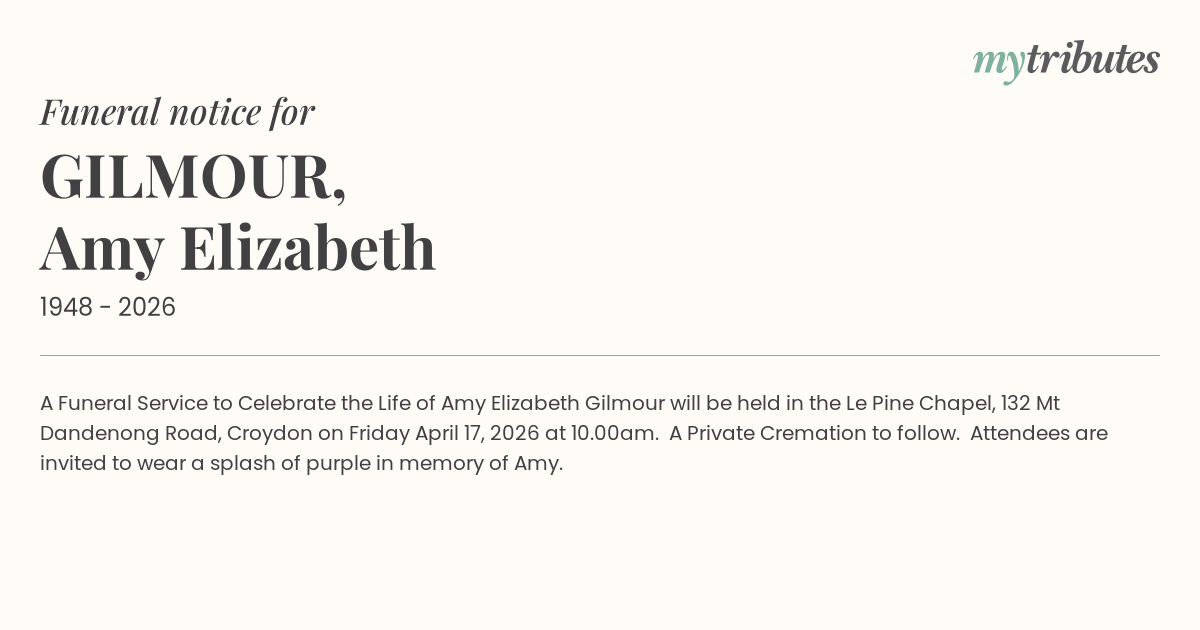 17°CA Funeral Service to Celebrate the Life of Amy Elizabeth Gilmour will be held in the Le Pine Chapel, 132 Mt Dandenong Road, Croydon on Friday April 17, 2026 at 10.00am. A Private Cremation to follow. Attendees are invited to wear a splash of purple in memory of Amy.