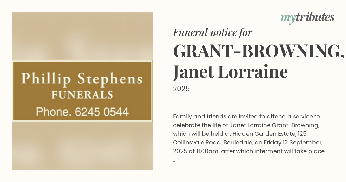 17°CFamily and friends are invited to attend a service to celebrate the life of Janet Lorraine Grant-Browning, which will be held at Hidden Garden Estate, 125 Collinsvale Road, Berriedale, on Friday 12 September, 2025 at 11.00am, after which interment will take place at St Mark’s Anglican Church, Pontville, at approx. 1.30pm.