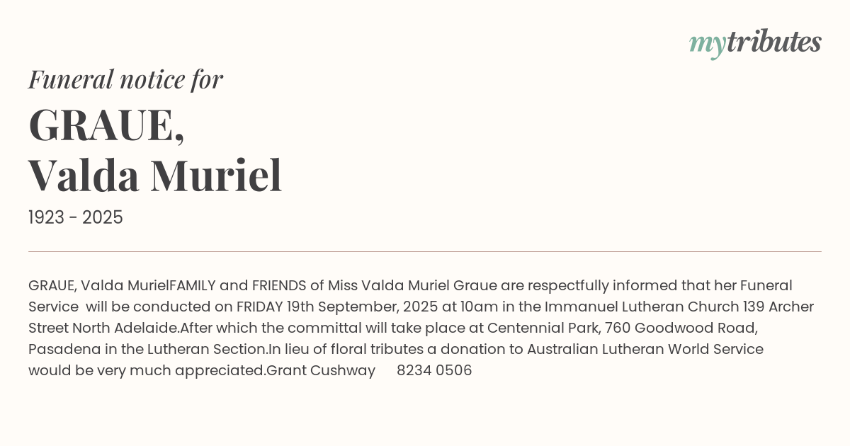 FAMILY and FRIENDS of Miss Valda Muriel Graue are respectfully informed that her Funeral Service will be conducted on FRIDAY 19th September, 2025 at 10am in the Immanuel Lutheran Church