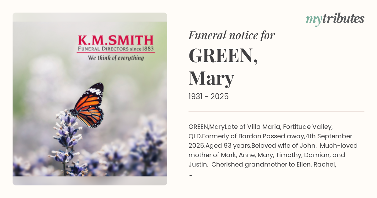 A Requiem Mass to celebrate Mary's life will be held in Holy Spirit Catholic Church, 17 Harriet Street, Auchenflower, on Thursday, 18th September 2025, commencing at 10.30 a.m.