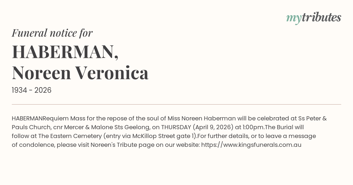 Requiem Mass for the repose of the soul of Miss Noreen Haberman will be celebrated at Ss Peter & Paul’s Church, cnr Mercer & Malone Sts Geelong, on THURSDAY (April 9, 2026) at 1:00pm.
