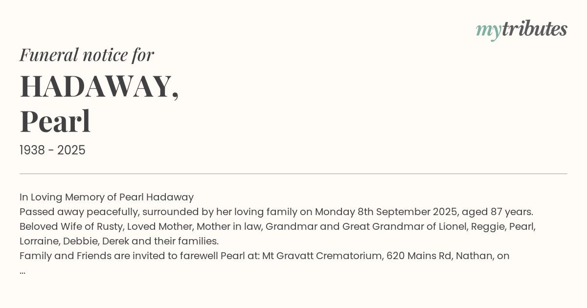 Family and Friends are invited to farewell Pearl at: Mt Gravatt Crematorium, 620 Mains Rd, Nathan, on Wednesday 17th September 2025, commencing at 11:00 am