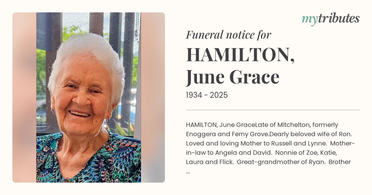 Family and Friends are invited to Farewell June in The Chapel, Pinnaroo Crematorium, Graham Road, Bridgeman Downs on Friday 26 September 2025 commencing at 11 am.