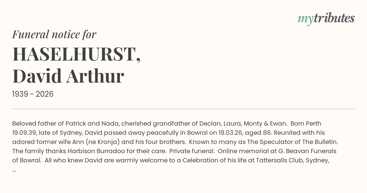 17°CBeloved father of Patrick and Nada, cherished grandfather of Declan, Laura, Monty & Ewan. Born Perth 19.09.39, late of Sydney, David passed away peacefully in Bowral on 19.03.26, aged 86. Reunited with his adored former wife Ann (née Kronja) and his four brothers. Known to many as “The Speculator” of The Bulletin.