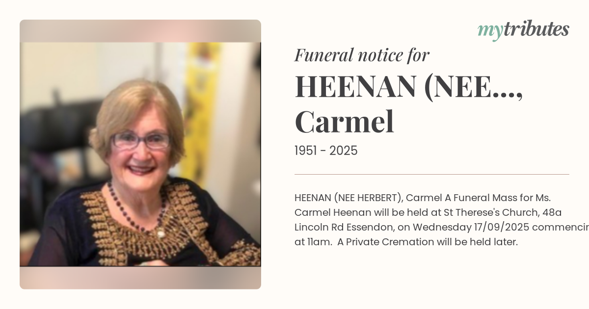 A Funeral Mass for Ms. Carmel Heenan will be held at St Therese's Church, 48a Lincoln Rd Essendon, on Wednesday 17/09/2025 commencing at 11am. A Private Cremation will be held later.