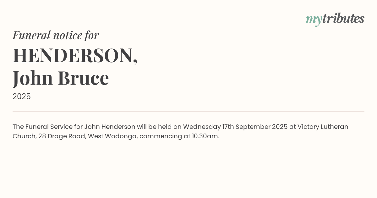 17°CThe Funeral Service for John Henderson will be held on Wednesday 17th September 2025 at Victory Lutheran Church, 28 Drage Road, West Wodonga, commencing at 10.30am.