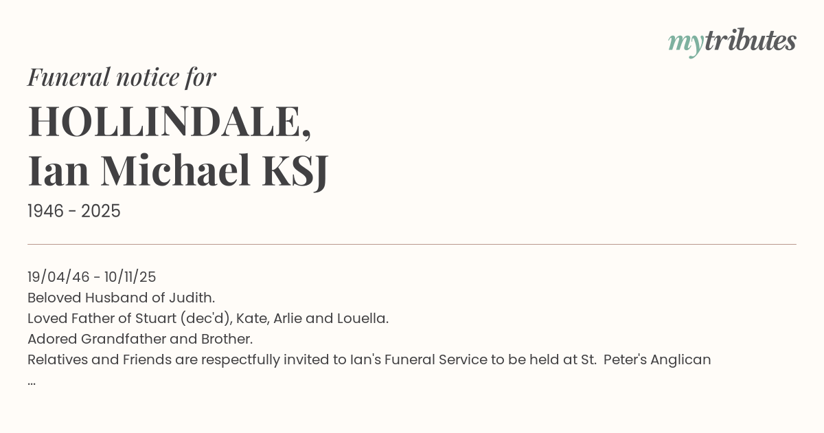 Relatives and Friends are respectfully invited to Ian's Funeral Service to be held at St. Peter's Anglican Church, 83 Nerang St, Southport.