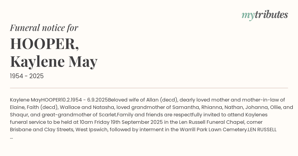 Family and friends are respectfully invited to attend Kaylene’s funeral service to be held at 10am Friday 19th September 2025 in the Len Russell Funeral Chapel, corner Brisbane and Clay Streets, West Ipswich, followed by interment in the Warrill Park Lawn Cemetery.