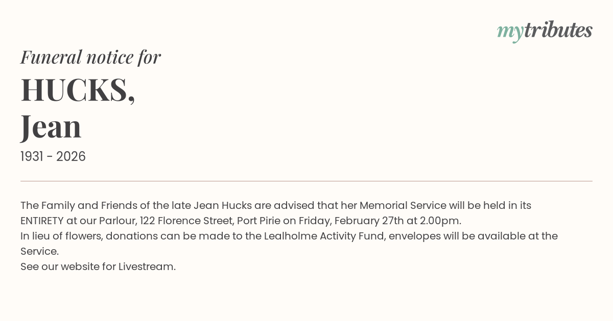 17°CThe Family and Friends of the late Jean Hucks are advised that her Memorial Service will be held in its ENTIRETY at our Parlour, 122 Florence Street, Port Pirie on Friday, February 27th at 2.00pm.