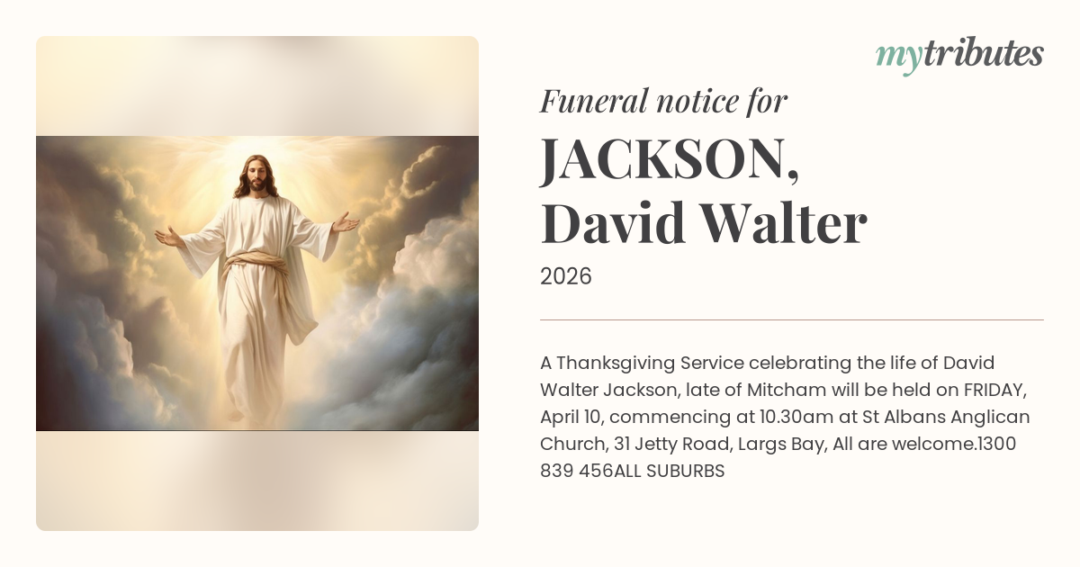 17°CA Thanksgiving Service celebrating the life of David Walter Jackson, late of Mitcham will be held on FRIDAY, April 10, commencing at 10.30am at St Alban’s Anglican Church, 31 Jetty Road, Largs Bay, All are welcome.