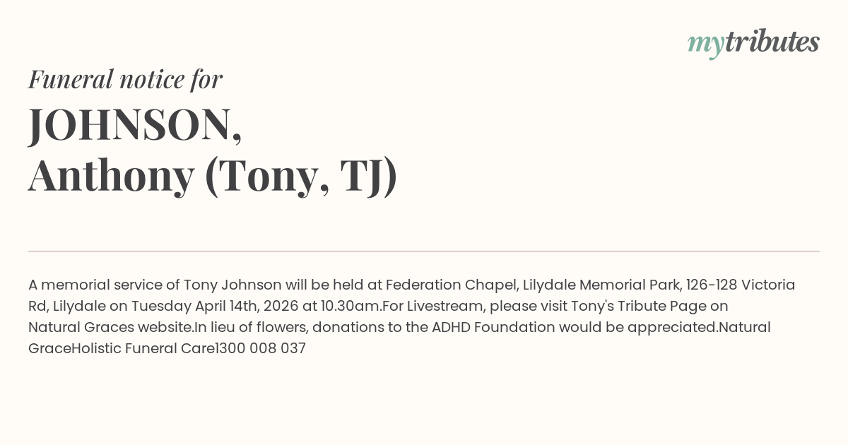 17°CA memorial service of Tony Johnson will be held at Federation Chapel, Lilydale Memorial Park, 126-128 Victoria Rd, Lilydale on Tuesday April 14th, 2026 at 10.30am.