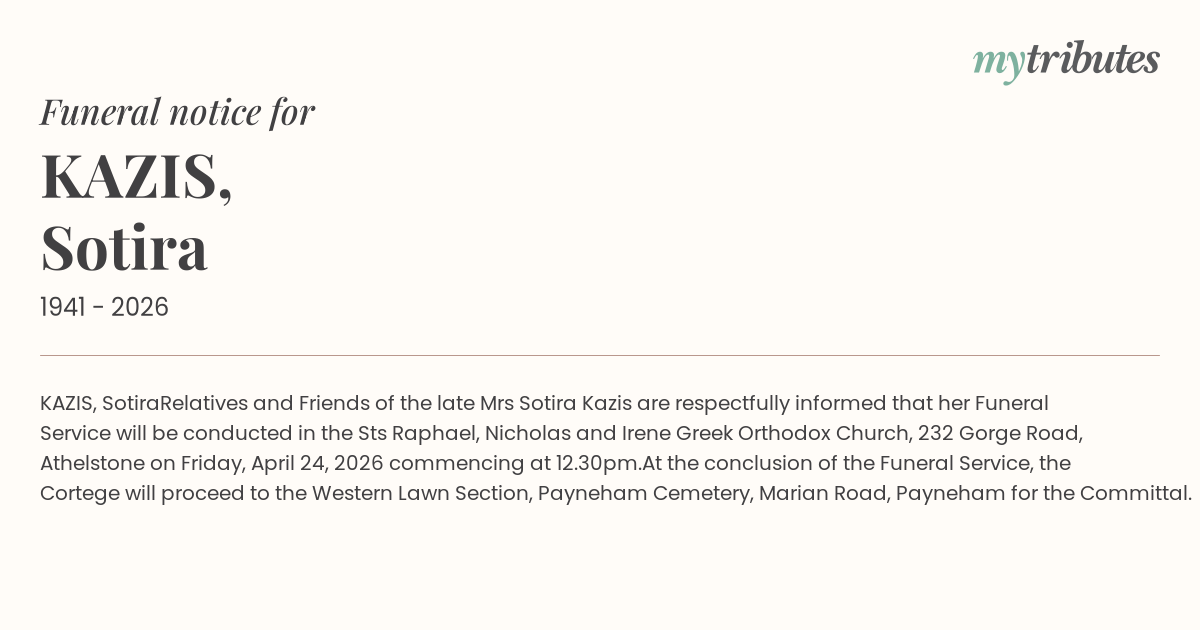 Relatives and Friends of the late Mrs Sotira Kazis are respectfully informed that her Funeral Service will be conducted in the