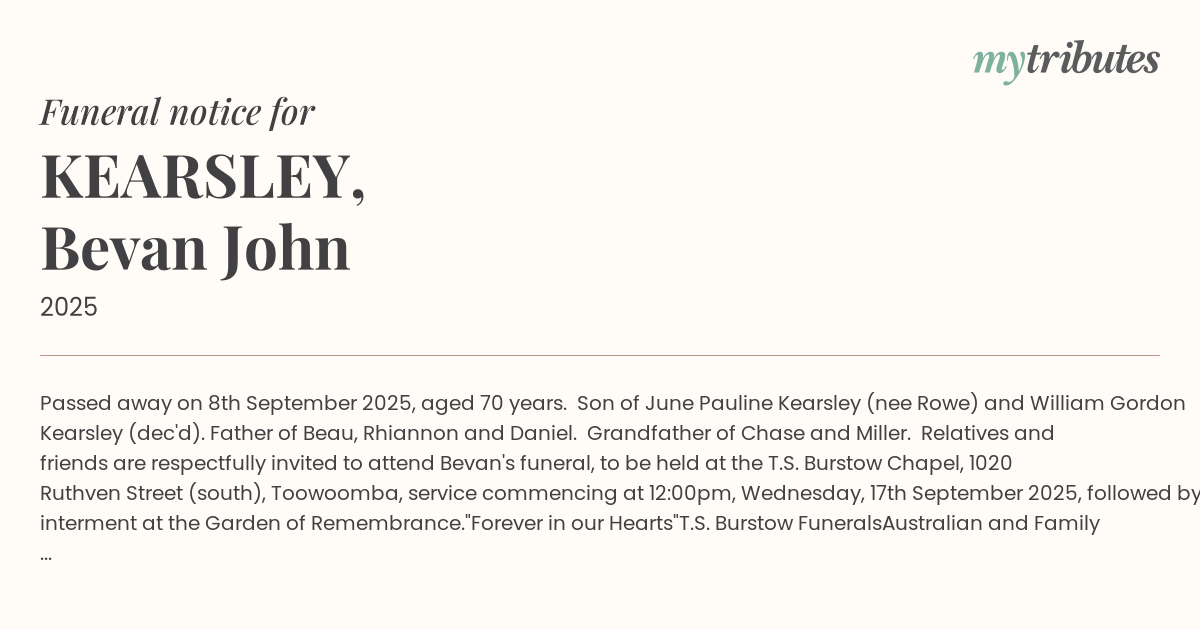 Relatives and friends are respectfully invited to attend Bevan's funeral, to be held at the T.S. Burstow Chapel, 1020 Ruthven Street (south), Toowoomba, service commencing at 12:00pm, Wednesday, 17th September 2025, followed by interment at the Garden of Remembrance.