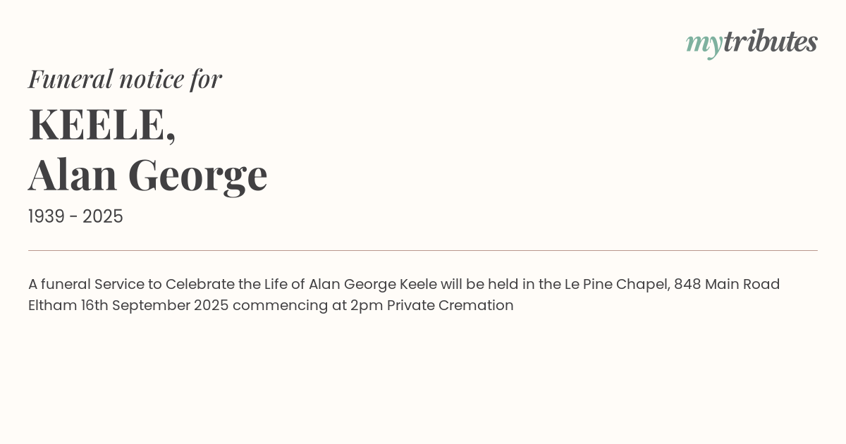 17°CA funeral Service to Celebrate the Life of Alan George Keele will be held in the Le Pine Chapel, 848 Main Road Eltham 16th September 2025 commencing at 2pm Private Cremation