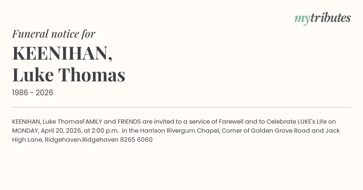 FAMILY and FRIENDS are invited to a service of Farewell and to Celebrate LUKE's Life on MONDAY, April 20, 2026, at 2:00 p.m. in the Harrison Rivergum Chapel, Corner of Golden Grove Road and Jack High Lane, Ridgehaven.