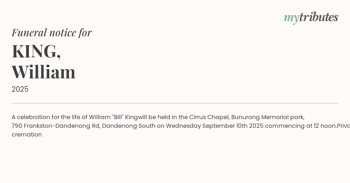 will be held in the Cirrus Chapel, Bunurong Memorial park, 790 Frankston-Dandenong Rd, Dandenong South on Wednesday September 10th 2025 commencing at 12 noon.