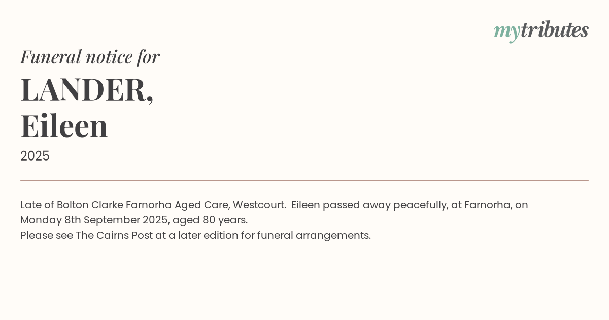 17°CLate of Bolton Clarke Farnorha Aged Care, Westcourt. Eileen passed away peacefully, at Farnorha, on