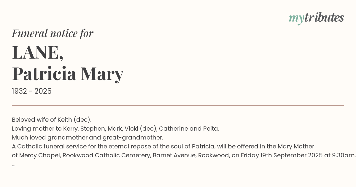A Catholic funeral service for the eternal repose of the soul of Patricia, will be offered in the Mary Mother of Mercy Chapel, Rookwood Catholic Cemetery, Barnet Avenue, Rookwood, on Friday 19th September 2025 at 9.30am.