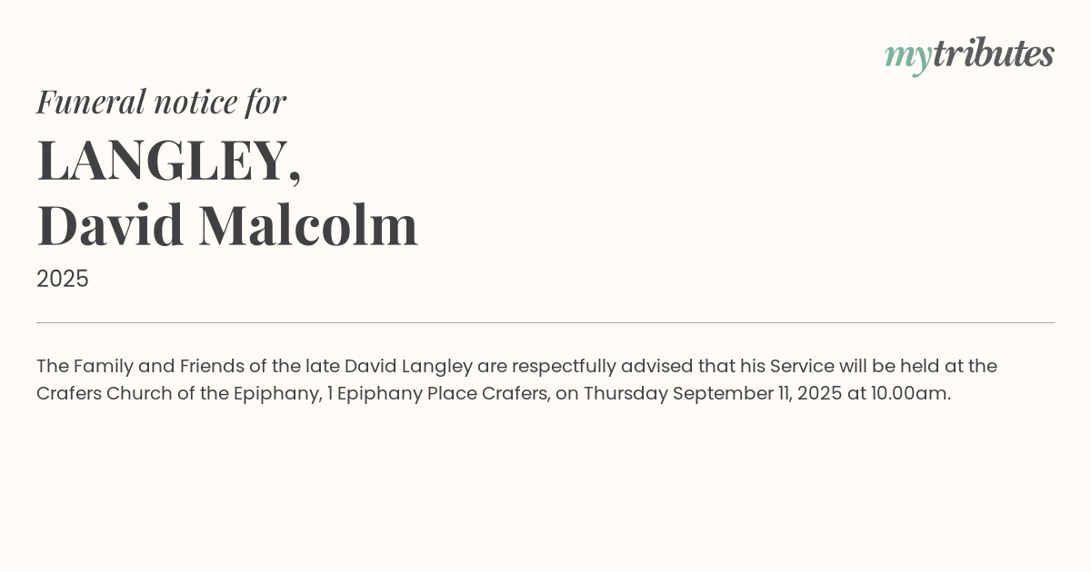 17°CThe Family and Friends of the late David Langley are respectfully advised that his Service will be held at the Crafers Church of the Epiphany, 1 Epiphany Place Crafers, on Thursday September 11, 2025 at 10.00am.