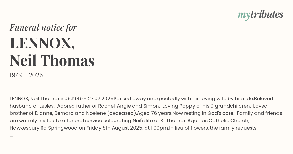 Family and friends are warmly invited to a funeral service celebrating Neil's life at St Thomas Aquinas Catholic Church, Hawkesbury Rd Springwood on Friday 8th August 2025, at 1:00pm.