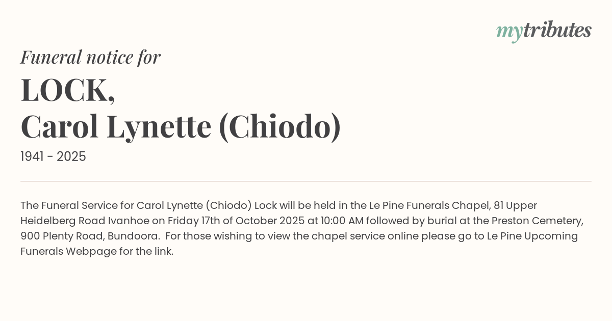 17°CThe Funeral Service for Carol Lynette (Chiodo) Lock will be held in the Le Pine Funerals Chapel, 81 Upper Heidelberg Road Ivanhoe on Friday 17th of October 2025 at 10:00 AM followed by burial at the Preston Cemetery, 900 Plenty Road, Bundoora. For those wishing to view the chapel service online please go to Le Pine Upcoming Funerals Webpage for the link.