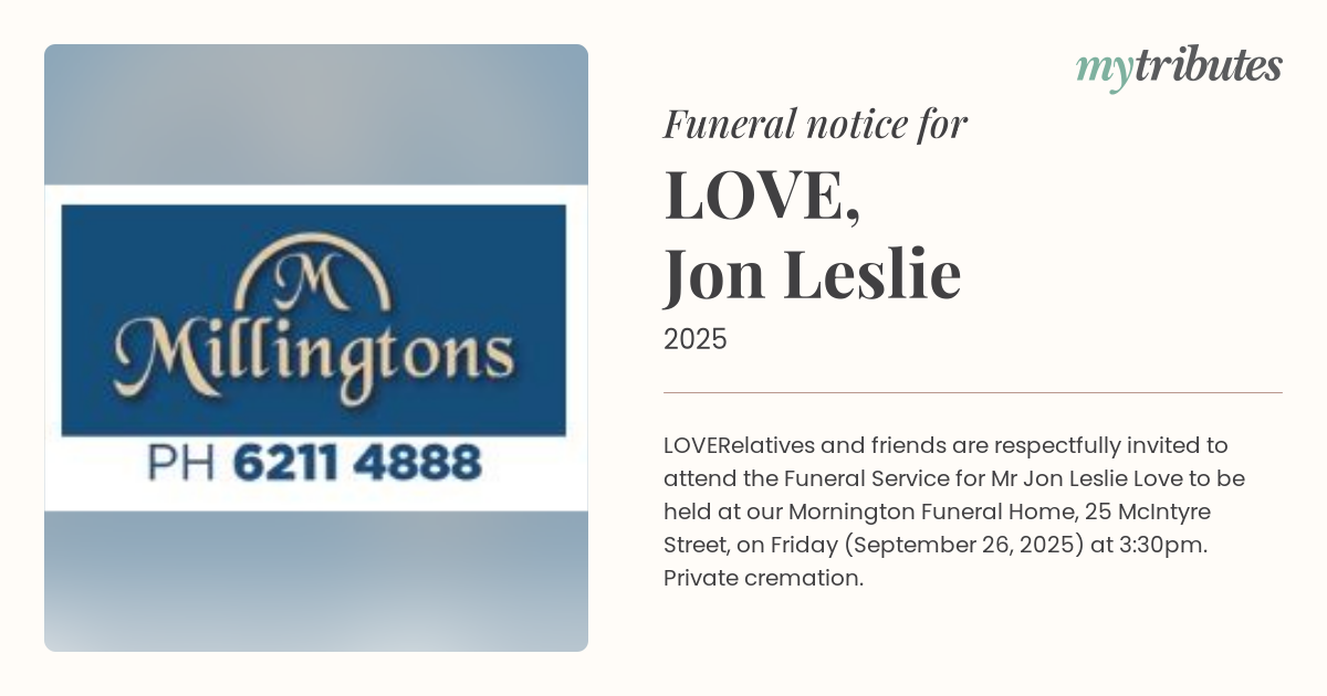 Relatives and friends are respectfully invited to attend the Funeral Service for Mr Jon Leslie Love to be held at our Mornington Funeral Home,