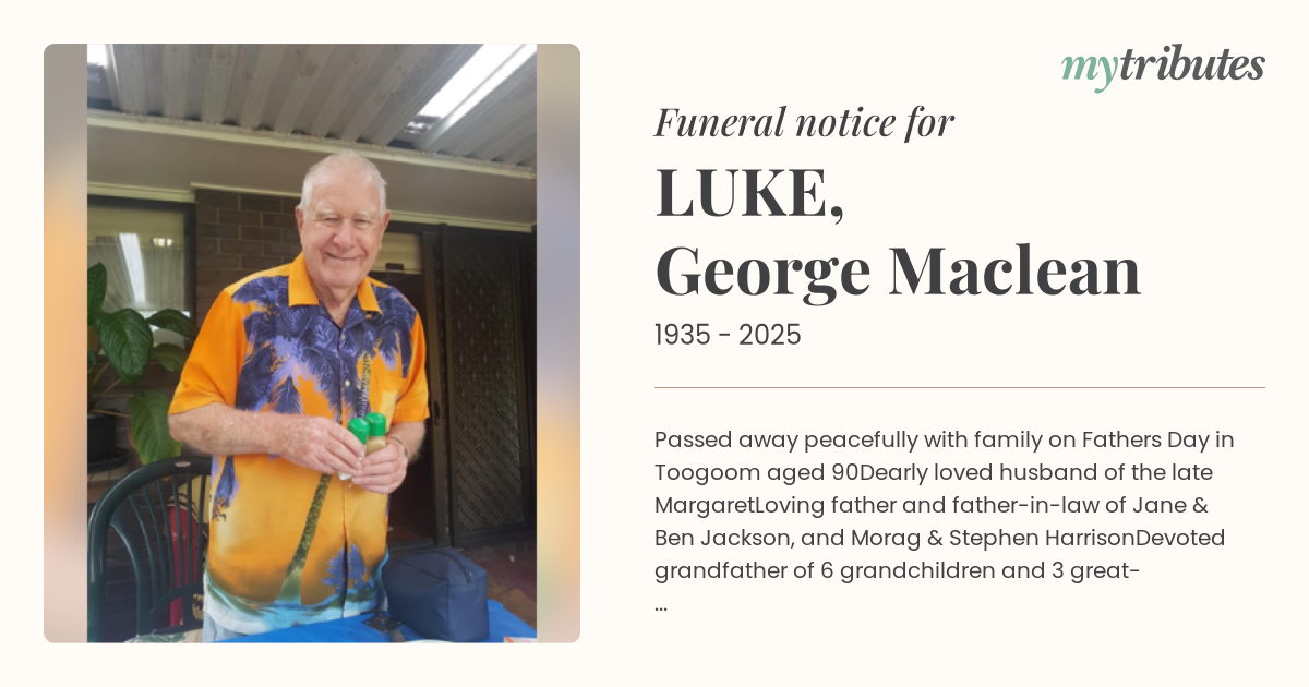 Family and Friends are invited to attend a funeral service for George at Fraser Coast Crematorium & Bayside Memorial Gardens, 18 Nikenbah Dundowran Road, Hervey Bay on Wednesday 17th September, 2025 commencing at 1:00pm