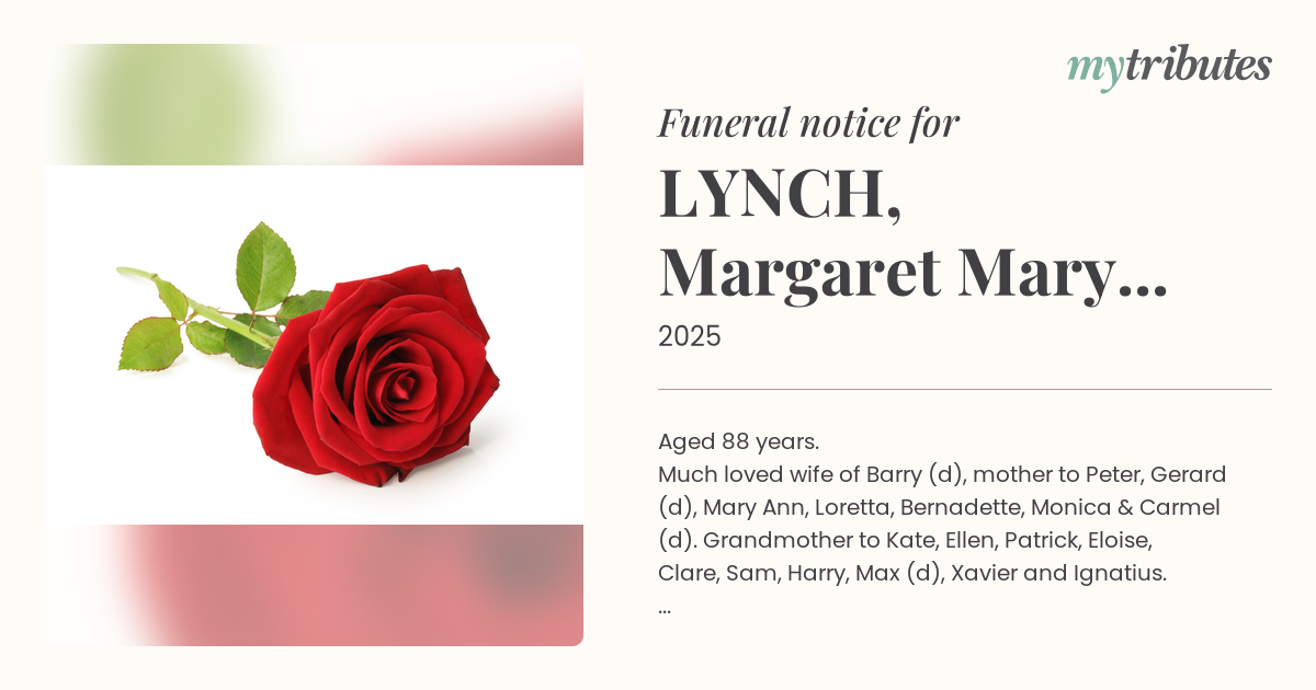 17°CAged 88 years. Much loved wife of Barry (d), mother to Peter, Gerard (d), Mary Ann, Loretta, Bernadette, Monica & Carmel (d). Grandmother to Kate, Ellen, Patrick, Eloise, Clare, Sam, Harry, Max (d), Xavier and Ignatius. Sister to Leo, Peter (d), and Patricia (Trish). Friends and family are welcome to celebrate Margaret's life with a Requiem Mass to be held at Our Lady of The Rosary Catholic Church, 1 Kenmore Road, Kenmore, on Thursday 25th September, at 2 p.m. Privately cremated.