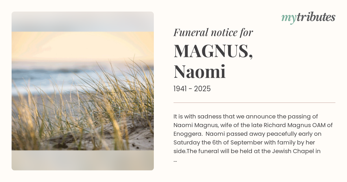 17°CIt is with sadness that we announce the passing of Naomi Magnus, wife of the late Richard Magnus OAM of Enoggera. Naomi passed away peacefully early on Saturday the 6th of September with family by her side.