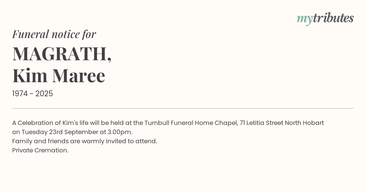 17°CA Celebration of Kim's life will be held at the Turnbull Funeral Home Chapel, 71 Letitia Street North Hobart on Tuesday 23rd September at 3.00pm.
