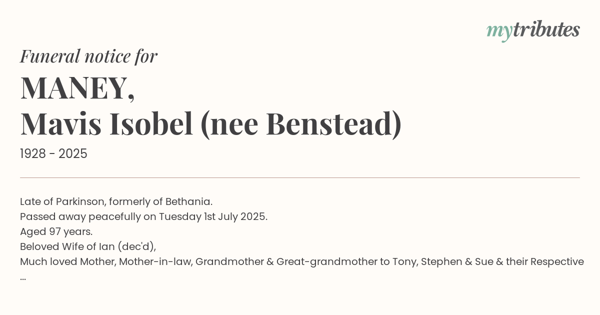 Relatives & Friends of Mavis are respectfully invited to attend Her Funeral Service to be held at Yellowwood Chapel, Eco Memorial Park, 21 Quinns Hill Rd W on Monday 14th July 2025 at 10am.