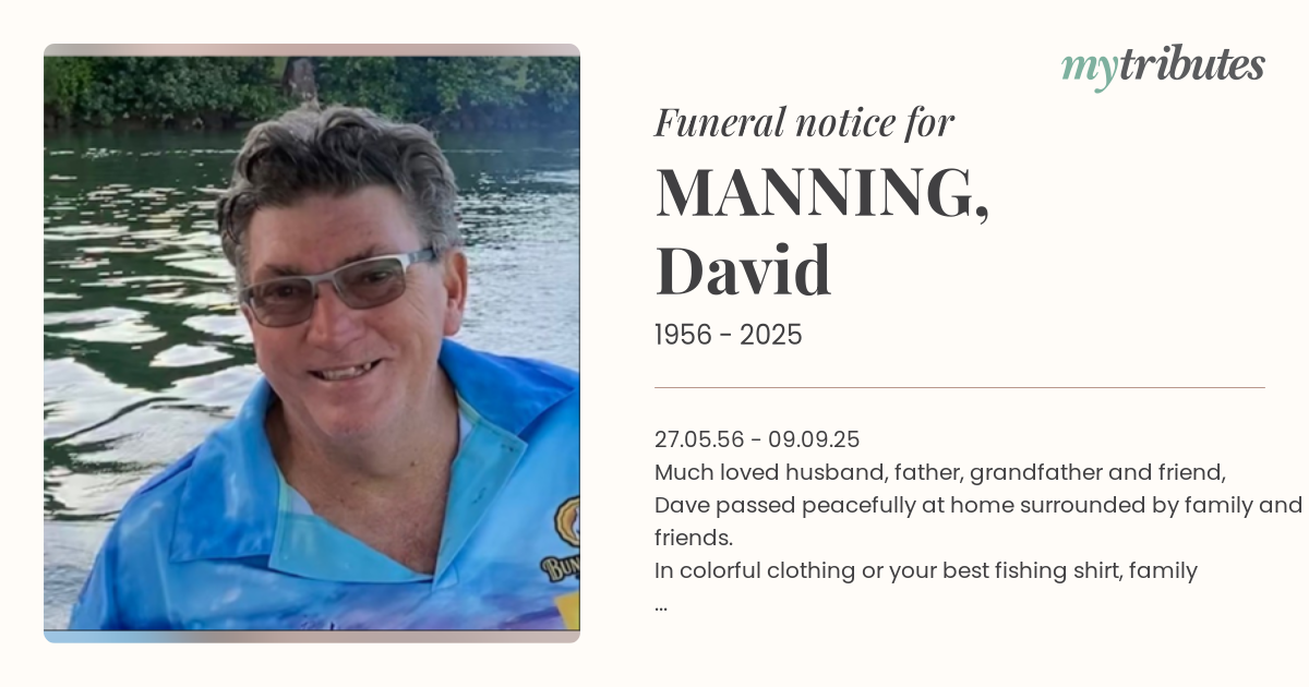 Much loved husband, father, grandfather and friend, Dave passed peacefully at home surrounded by family and friends.