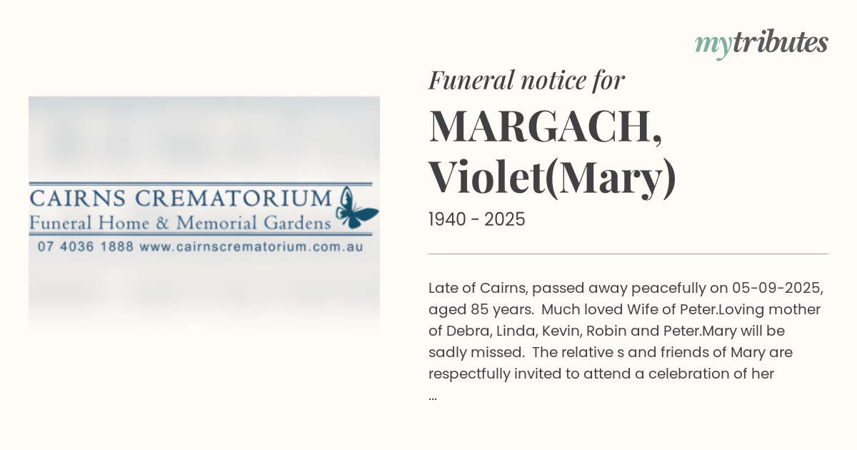 Mary will be sadly missed. The relative s and friends of Mary are respectfully invited to attend a celebration of her life which will be held at Cairns Crematorium Funeral Home and Memorial Gardens at 79-85 Foster Road, Mt Sheridan, Qld on the 18-09-2025 commencing at 10am. Please meet at the Chapel