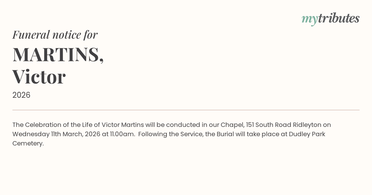 17°CThe Celebration of the Life of Victor Martins will be conducted in our Chapel, 151 South Road Ridleyton on Wednesday 11th March, 2026 at 11.00am. Following the Service, the Burial will take place at Dudley Park Cemetery.