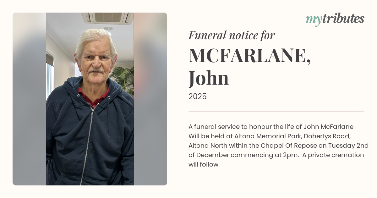 17°CA funeral service to honour the life of John McFarlane Will be held at Altona Memorial Park, Dohertys Road, Altona North within the Chapel Of Repose on Tuesday 2nd of December commencing at 2pm. A private cremation will follow.