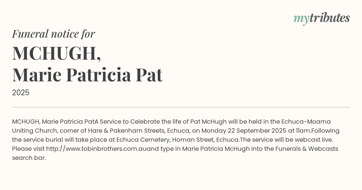 A Service to Celebrate the life of Pat McHugh will be held in the Echuca-Moama Uniting Church, corner of Hare & Pakenham Streets, Echuca, on Monday