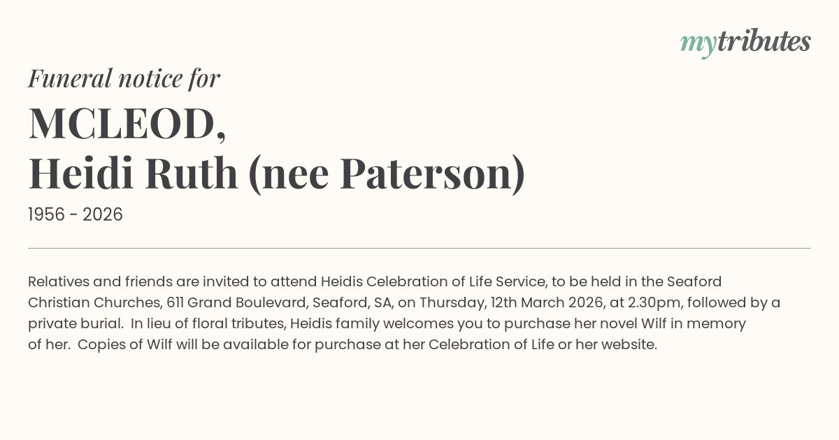 17°CRelatives and friends are invited to attend Heidi’s Celebration of Life Service, to be held in the Seaford Christian Churches, 611 Grand Boulevard, Seaford, SA, on Thursday, 12th March 2026, at 2.30pm, followed by a private burial. In lieu of floral tributes, Heidi’s family welcomes you to purchase her novel “Wilf” in memory of her. Copies of “Wilf” will be available for purchase at her Celebration of Life or her website.
