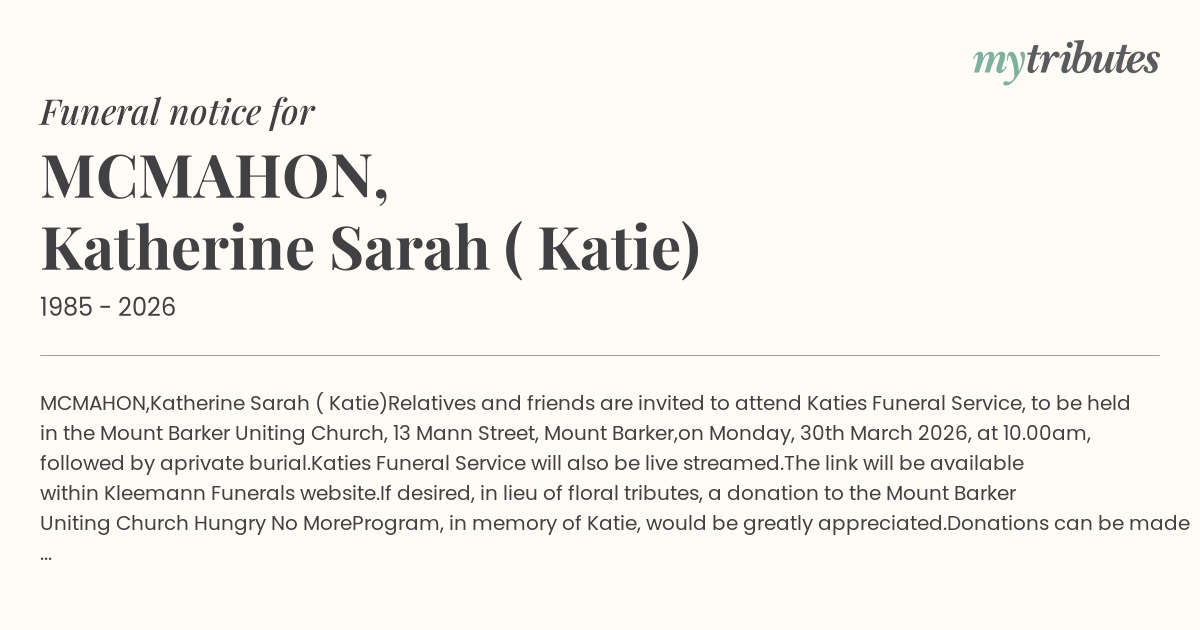 Relatives and friends are invited to attend Katie’s Funeral Service, to be held in the Mount Barker Uniting Church, 13 Mann Street, Mount Barker,