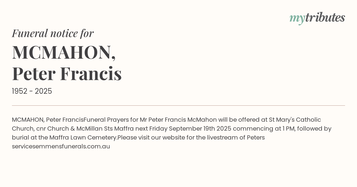 Mr Peter Francis McMahon will be offered at