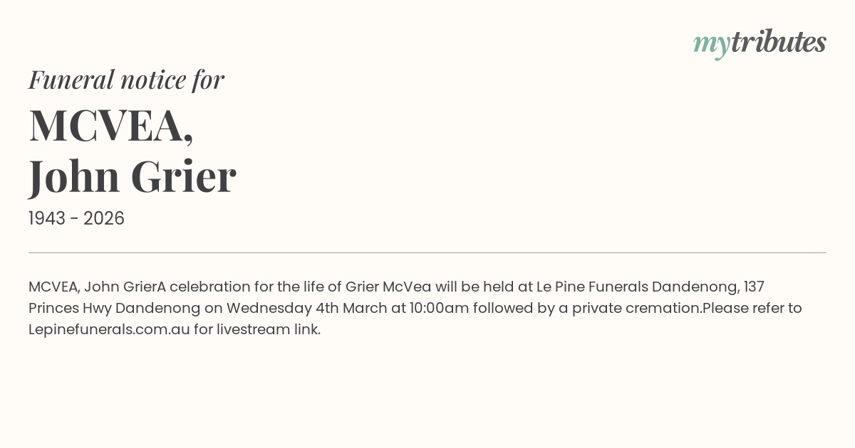 A celebration for the life of Grier McVea will be held at Le Pine Funerals Dandenong, 137 Princes Hwy Dandenong on Wednesday 4th March at 10:00am followed by a private cremation.