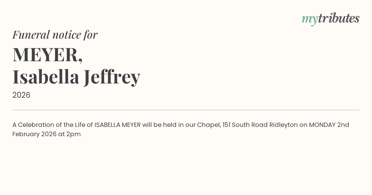 17°CA Celebration of the Life of ISABELLA MEYER will be held in our Chapel, 151 South Road Ridleyton on MONDAY 2nd February 2026 at 2pm