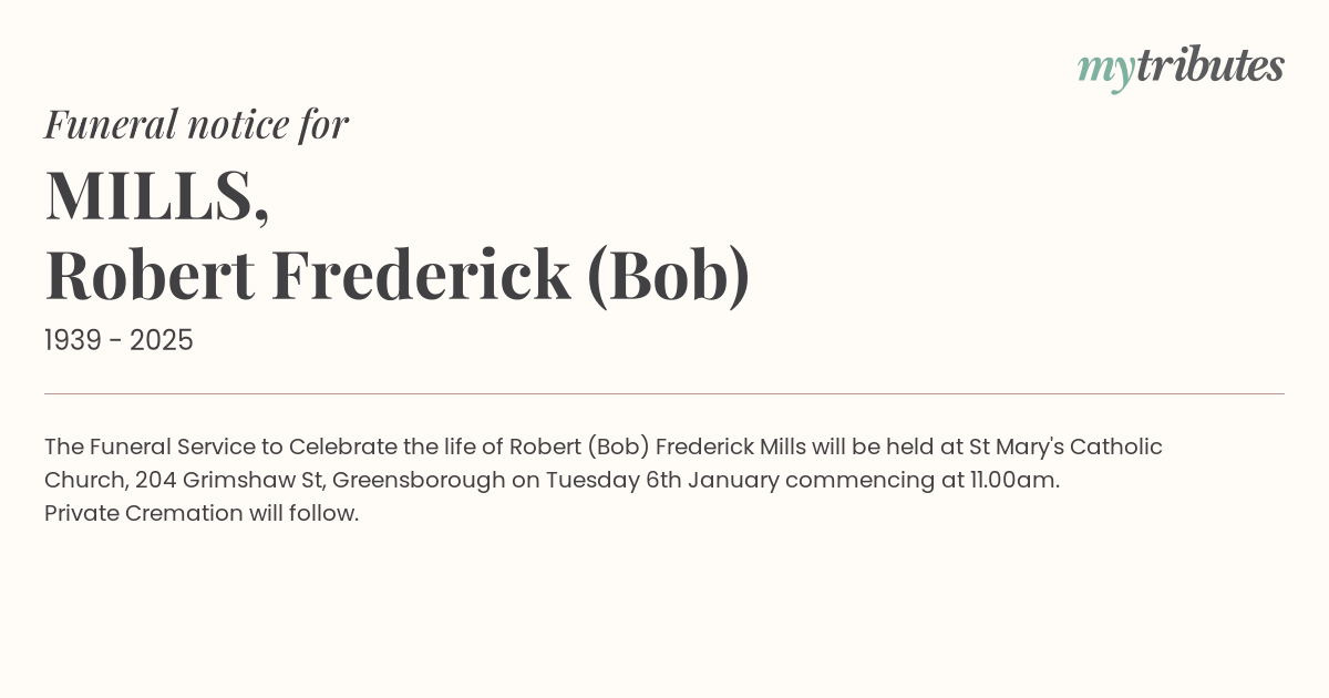 17°CThe Funeral Service to Celebrate the life of Robert (Bob) Frederick Mills will be held at St Mary's Catholic Church, 204 Grimshaw St, Greensborough on Tuesday 6th January commencing at 11.00am.
