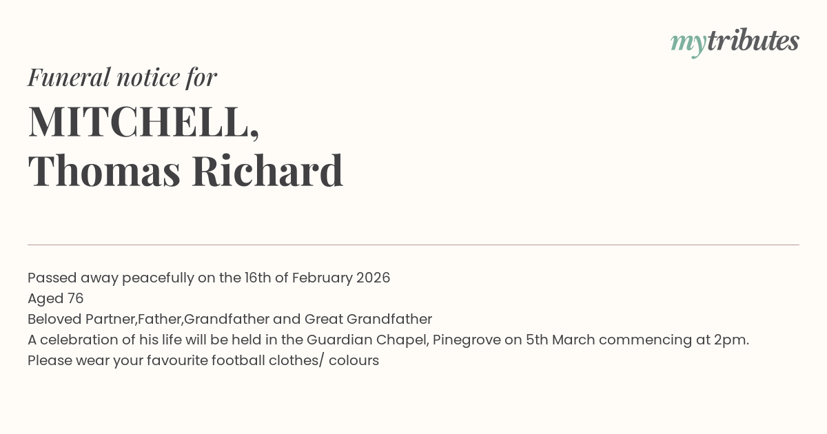 A celebration of his life will be held in the Guardian Chapel, Pinegrove on 5th March commencing at 2pm.