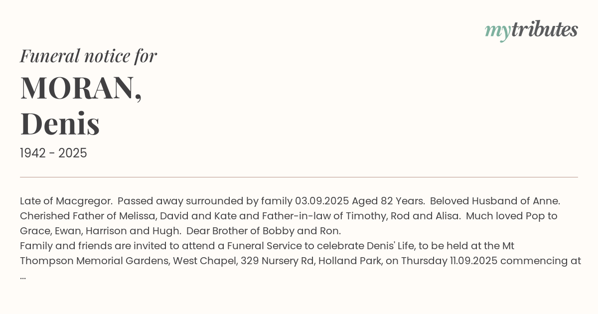 Family and friends are invited to attend a Funeral Service to celebrate Denis' Life, to be held at the Mt Thompson Memorial Gardens, West Chapel, 329 Nursery Rd, Holland Park, on Thursday 11.09.2025 commencing at 3p.m.
